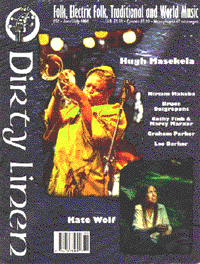Dirty Linen #52, Jun/Jul 1994 – Hugh Masekela, Miriam Makeba, Kate Wolf, Bruce Daigrepont, Cathy Fink & Marcy Marxer, Graham Parker, Les Barker, Vic Chesnutt, Micho Russell, Scotland’s Borders, New Releases from Brittany, Professor Longhair, Drumming Instructional Videos