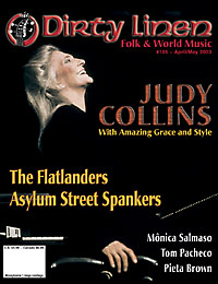 Dirty Linen #105, Apr/May 2003 – Judy Collins, The Flatlanders, Asylum Street Spankers, Tom Pacheco, Shelton Manuel, Jon Vezner, Pieta Brown, Mônica Salmaso, Bob McQuillen, Reel World, Unpacking the Panoply, recording reviews, book reviews, concert reviews, video reviews, Wee Folk, letters to the editor