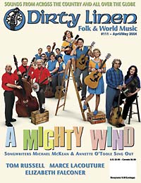 Dirty Linen #111, Apr/May 2004 – Michael McKean & Annette O’Toole of A Mighty Wind, Tom Russell, Marce Lacouture, Elizabeth Falconer, Damien Barber, Maria de Barros, The Magnolia Cajun Band, Bob Dylan at Philharmonic Hall, concert reviews, recording reviews, book reviews, video reviews, news