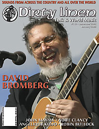 Dirty Linen #115, Dec 2004/Jan 2005 – David Bromberg, Aoife Clancy, John Mayall, Angelique Kidjo, Robin Bullock, The Kennedys, Rosalie Sorrels, The Cucumbers, John Roberts & Tony Barrand, Beautiful Dreamer – The Songs of Stephen Foster, The Reel World, Unpacking the Panoply, concert reviews, recording reviews, holiday reviews, book reviews, video reviews, news